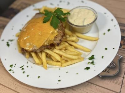 The PUB Cheeseburger - možno objednat i vegetariánskou verzi - naše sezamová bulka, 120g mletého hovězího masa, sýr čedar, slanina, majonéza, kečup, ledový salát, kyselá okurka, červená cibulka, hranolky A (1, 3, 7, 9, 10, 11) 13791011