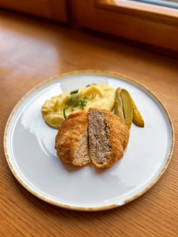 | 2. | Obrácený kuřecí řízek se slaninou a cibulí, vařené brambory s máslem, naše tatarka 137 | 189 Kč |
