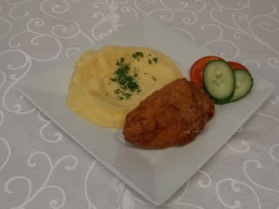 Kuřecí steak se šunkou a sýrem, pikantní omáčka, hranolky