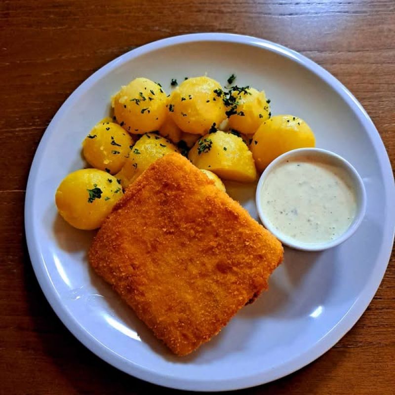 100g Smažené blaťácké zlato s vařenými bramborami a tatarskou omáčkou