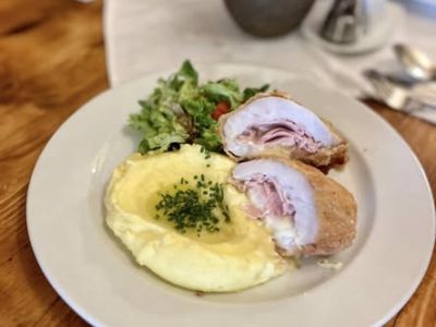 Menu 5: 259 150g Zapečený kuřecí steak se šunkou a sýrem gouda, krokety