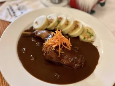1ks Pečené Králičí stehýnko s bůčkem dušené zelí a knedlíky