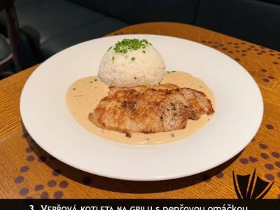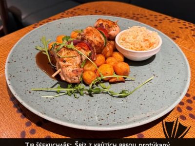 SPECIALITA DNE: Sekaná z krůtího masa z české farmy s bramborovo-dýňovým pyré a malým rajčatovým salátem [1, 3, 7, 12]