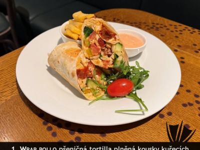Wrap s trhaným kachním masemn, omáčkou Hoisin a zeleninou, bramborové hranolky, česneko-medový dip