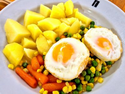 Pečená farmářská klobása s bramborovou kaší, volské oko, kyselá okurka