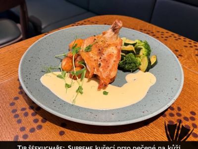 Kuřecí prso 150g šťavnaté kuřecí prso marinované v čerstvých bylinkách a opečené dozlatova, podávané na jemné máslové bramborové kaši. Přelité silnou, redukovanou omáčkou a sladce karamelizovaná šalotka (1,7,9,12)