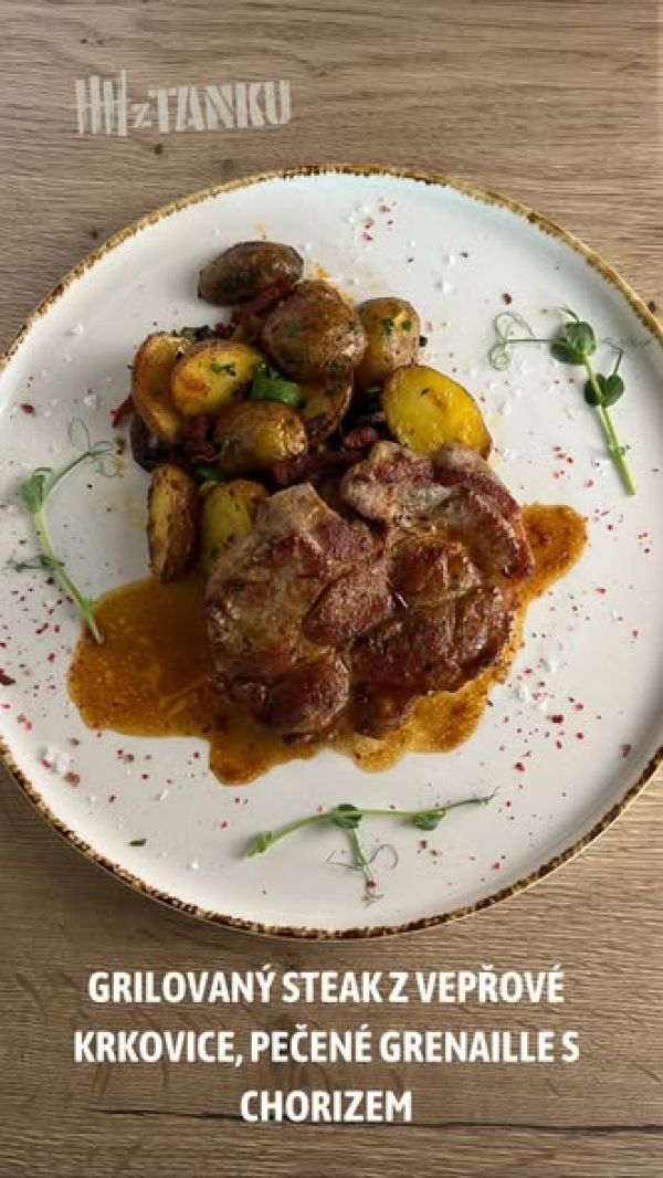 | 2. | Grilovaný steak z vepřové krkovice, pečené grenaille s chorizem | 195 Kč |