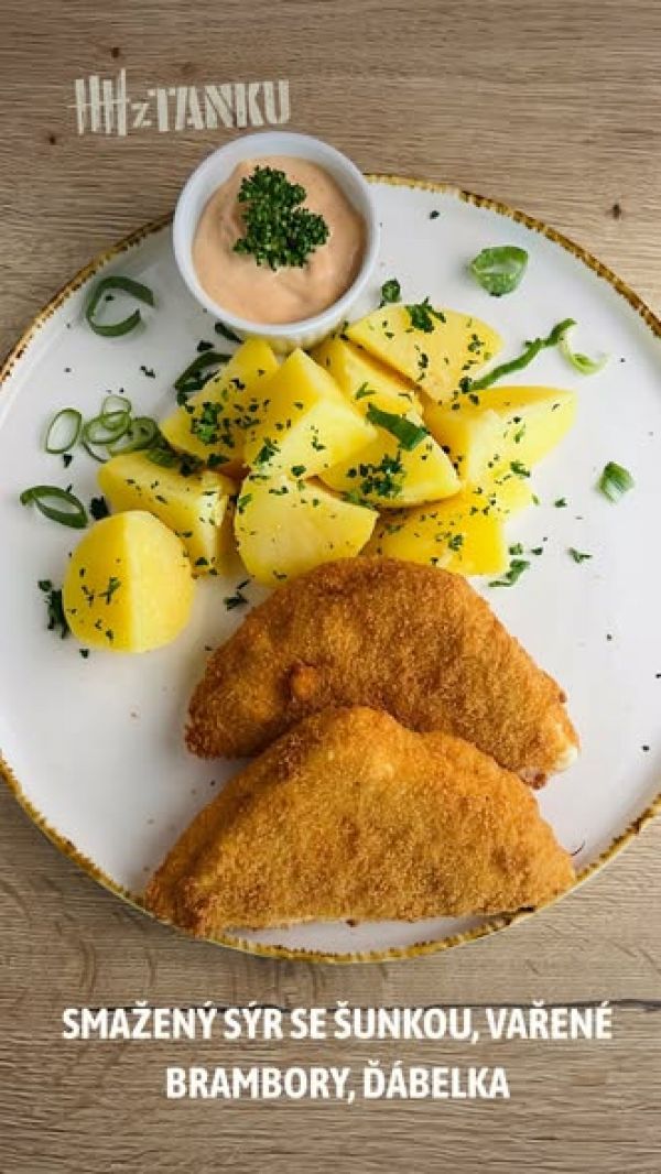 | 4. | Smažený sýr se šunkou, vařené brambory, ďábelka | 179 Kč |