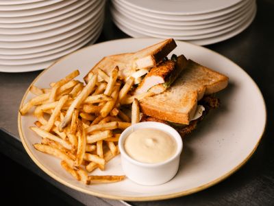Kuřecí steak s cheddarovou omáčkou, hranolky