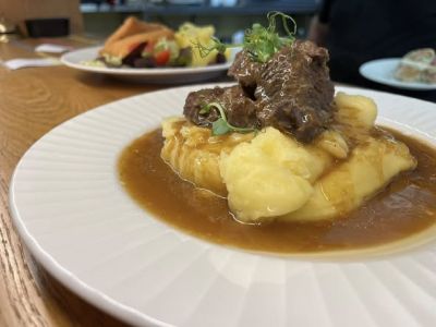 Hovězí guláš na plzeňském pivu s česnekovými bramboráčky –