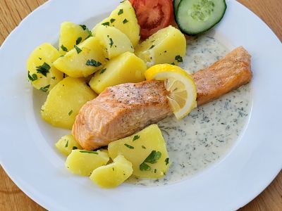 150g ČERSTVÝ LOSOS na grilu s limetkovou omáčkou podávaný s vařeným bramborem