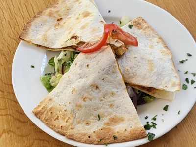 150g TACOS CHICKEN podávané s BBQ omáčkou (kuřecí prsíčko filované na jemné plátky s restovanou čerstvou zeleninkou gratinované sýrem servírované v mini tortillách)