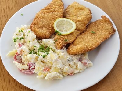 150 g Kuřecí řízek "Rošťák", vařené brambory, míchaný zeleninový salátek 1, 3, 7, 12 13712