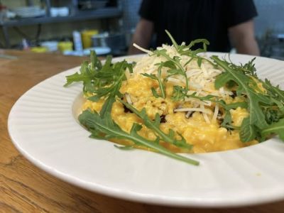 DÝŇOVÉ RIZOTO bezlepkové, bezmasé na bílém víně, mascarpone, rýže arborio, dýňový olej, sýr Grana Padano, rukola 7