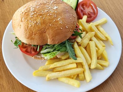 Hovězí Burger (slanina, volské oko, cheddar), hranolky, tatarka 137