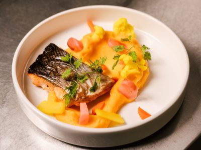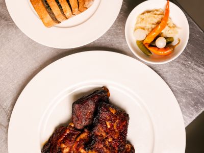 4) Grilovaný steak z kuřecího prsíčka, silná výpeková omáčka, opékané brambory, tatarská omáčka, salátek (1,3,6,7,9) 150g