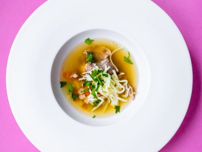 Slepičí vývar s masem, zeleninou a rýžovými nudlemi 45, -