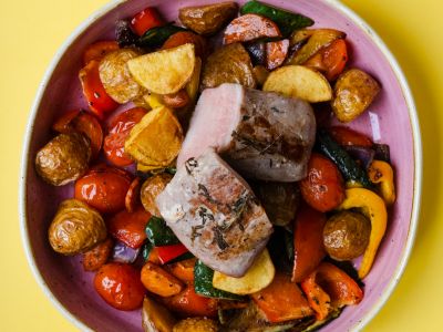 200g Kuřecí supreme Sous-vide, zeleninové ratatouille, bramborové pyré, tymiánový jus