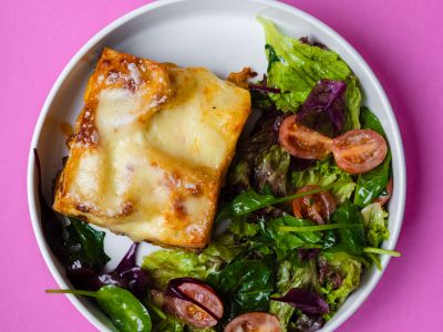 Salátová mísa se smaženými hermelínovými nugetkami, jogurtový dresing, opečená bageta (A 1, 3, 7) 137
