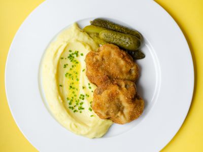 150gSmažené řízečky z kuřecích prsou, bramborová kaše, sterilovaný okurek
