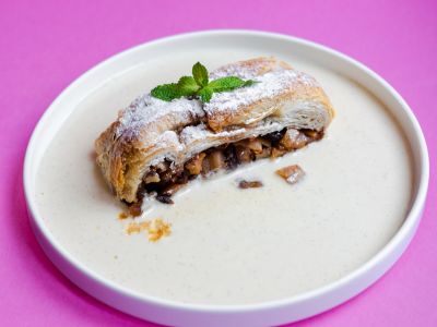 150g Přírodní plněná kuřecí kapsa hermelínem a poličanem, pečené brambory, tatarka 1 3 10