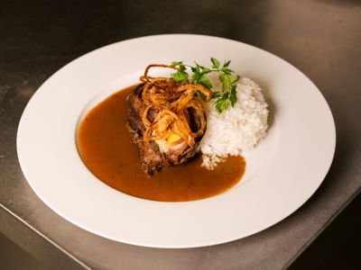 1) Konfitovaná kuřecí stehna s naší nádivkou a dušenou rýží (1,3,6,7,9) 240g