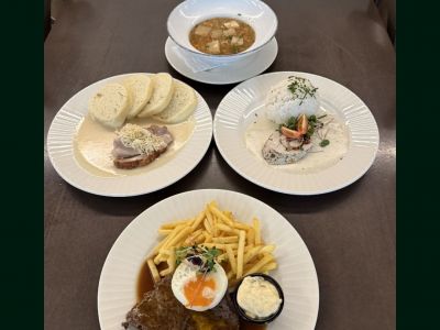 Posádkové menu: Kedlubnová polévka + Vánoční šunka, houbový Kuba + Tvarohová štola, ovoce, ořechy