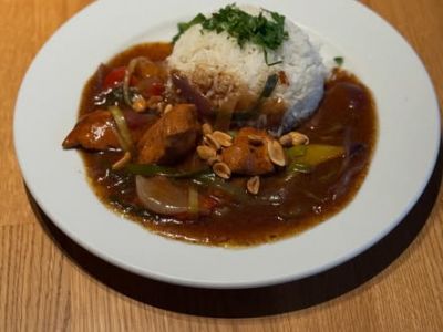 🔸Kuřecí mango curry - kuřecí prso marinované v jogurtu, česneku a zázvoru, curry mango omáčka, jasmínová rýže, koriander, chilli, jarní cibulka, arašídy