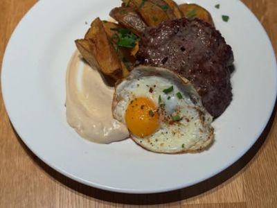 Vyzrálý hovězí Rump steak, batátové hranolky, pepřová omáčka