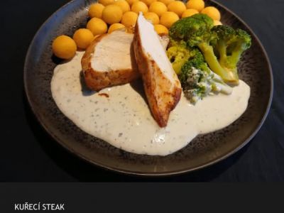 B) Kuřecí plátek na bylinkách s pepřovou omáčkou a smaženými kroketami 137