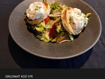 Salát s grilovaným kozím sýrem mix listových salátů, cherry rajčata, vlašské ořechy, marinovaný okurek, granátové jablko, medovo-citronová zálivka, bylinková bageta