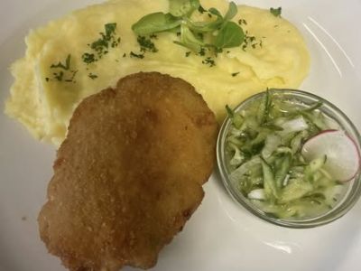 Smažený vepřový karbanátek, bramborová kaše s restovanou cibulkou, okurek 1a37