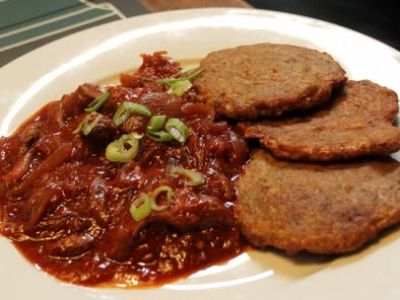 Hovězí guláš na plzeňském pivu s česnekovými bramboráčky –