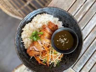 Gá Rán - smažené kuřecí kousky s omáčkou ze sójové a hoisin omáčky, limetových listu a chilli, salát z čerstvé zeleniny, jasmínová rýže 175 Kč