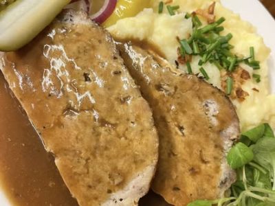 Medailonky z vepřové panenky, omáčka ze sušených švestek, opékané bramborové plátky s česnekem a rozmarýnem 79