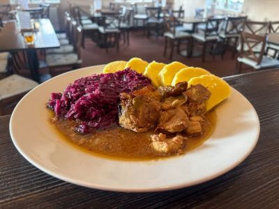 Krkovička na kmíně s dušeným hlávkovým zelím, bramborový knedlík