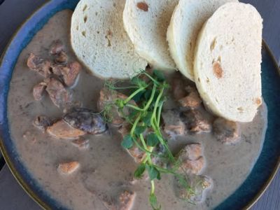 250g Šťavnatý steak z vepřové krkovice na omáčce ze zeleného pepře se smetanou, staročeské dukátky s česnekem 17