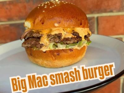 Big mac hovězí smash burger, big mac majonéza, cheddar, slanina, ledový salát, hranolky