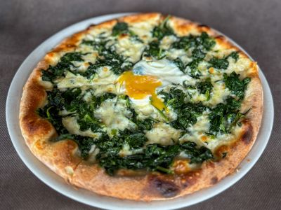 200g Pečené králičí stehno na slanině se špenátem a bramborový knedlík