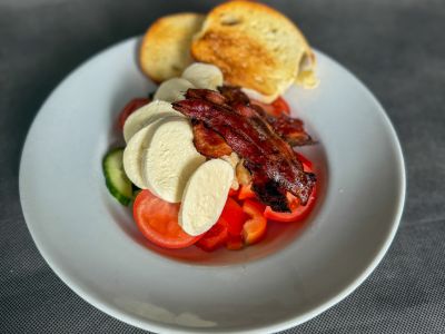 Trhané maso, bramborové dukátky, slanina, čedar, dresing