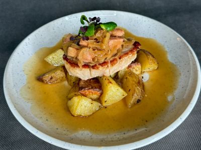 140g Steak z lososa s Holandskou omáčkou a mačkaný brambor s jarní cibulkou