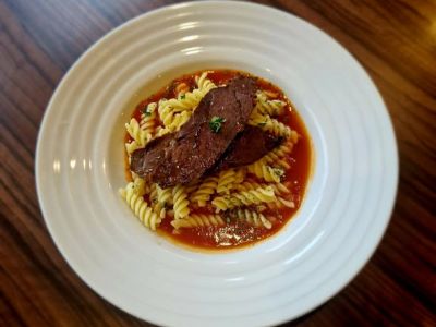 KUŘECÍ PRSO V JOGURTU zapečené s Gran biraghi - RIGATONI s bylinkovým pestem, sušené rajčata, petrželka - strouhaný Gran biraghi 1, 3, 7