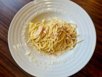 Špagety s kuřecím masem, drcenými rajčaty, smetanou a bazalkou, sypané parmezánem 137