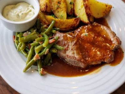 150g Steak z krkovičky, omáčka z medvědího česneku, hranolky 7
