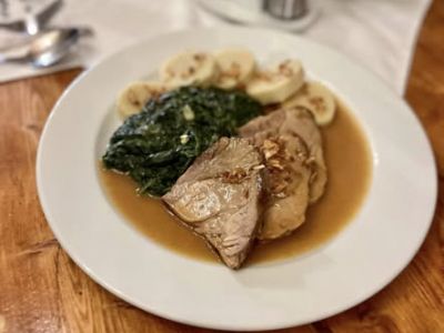 Moravský vrabec na česneku se smetanovým špenátem a bramborovými knedlíky