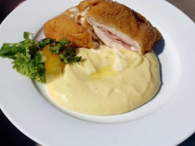 Kuřecí Gordon Blue- smažená kuřecí kapsa se šunkou a ementálem podávané s bramborovou kaší a malým šopským salátkem