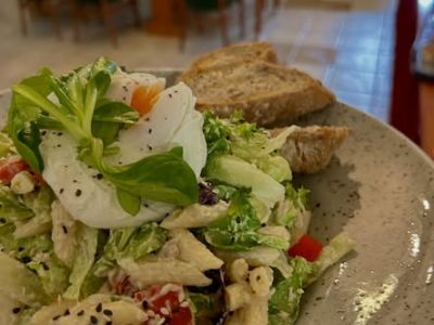 300g Zeleninový salát s grilovaným hermelínem a brusinkami, opečená bagetka
