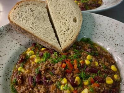 150 g Mexický hovězí guláš se zeleninou a fazolemi, opečený chléb
