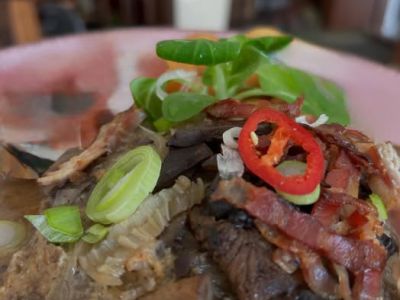 Steak z vepřové krkovice s beraními rohy a slaninovým chipsem, brambory s cibulkou 37