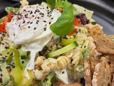 Oběd 3 Hrstková polévka, těstovinový salát s vejci, moučník, nápoj A